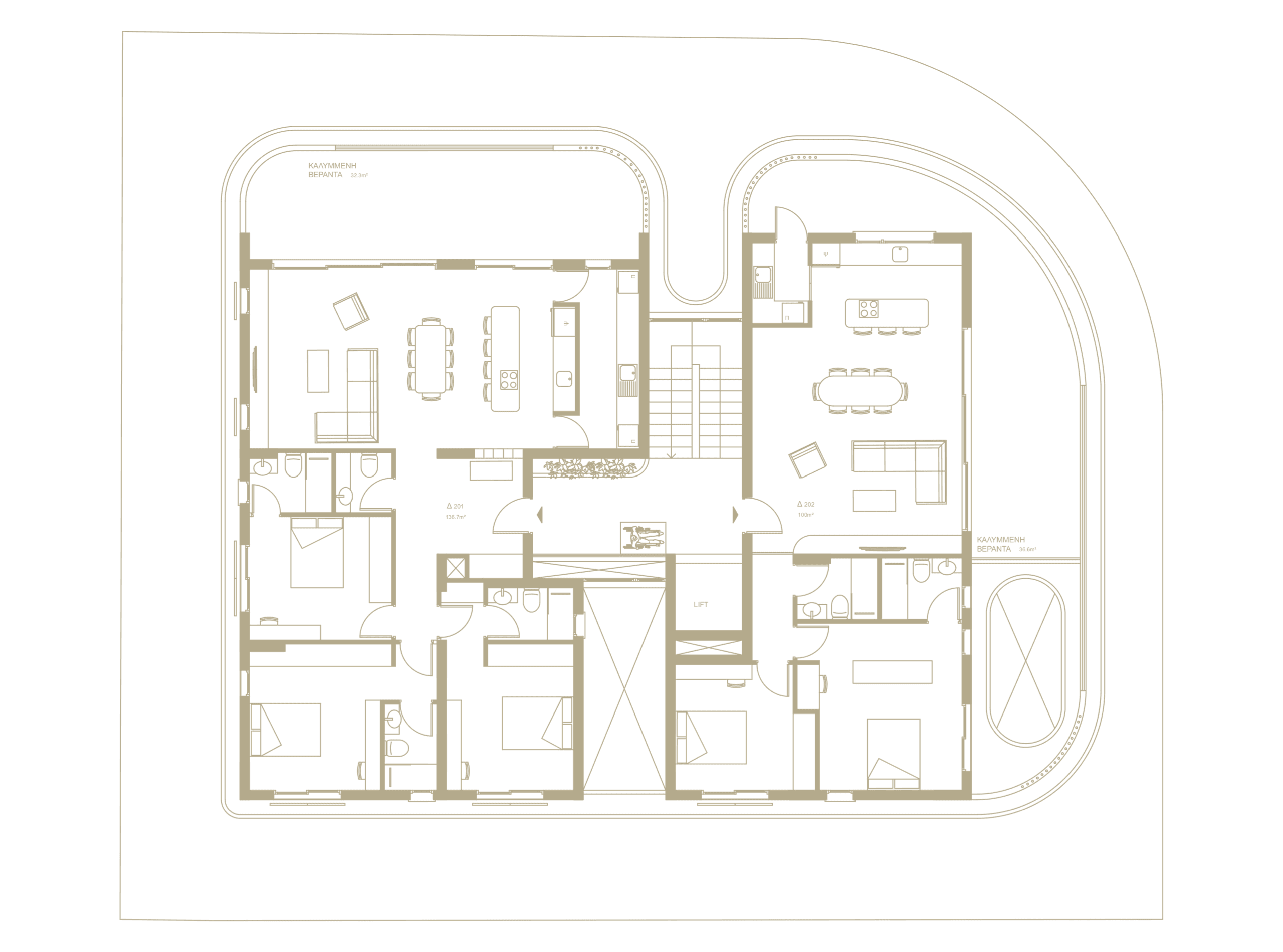 A thoughtfully designed floor plan featuring one spacious 3-bedroom apartment and one large 2-bedroom apartment, each fully detached for optimal privacy. Both residences include open-plan kitchen, dining, and living areas that open onto expansive covered verandas. Both apartments enjoy exclusive access to private roof gardens, extending the living experience with dedicated outdoor space above the city.
