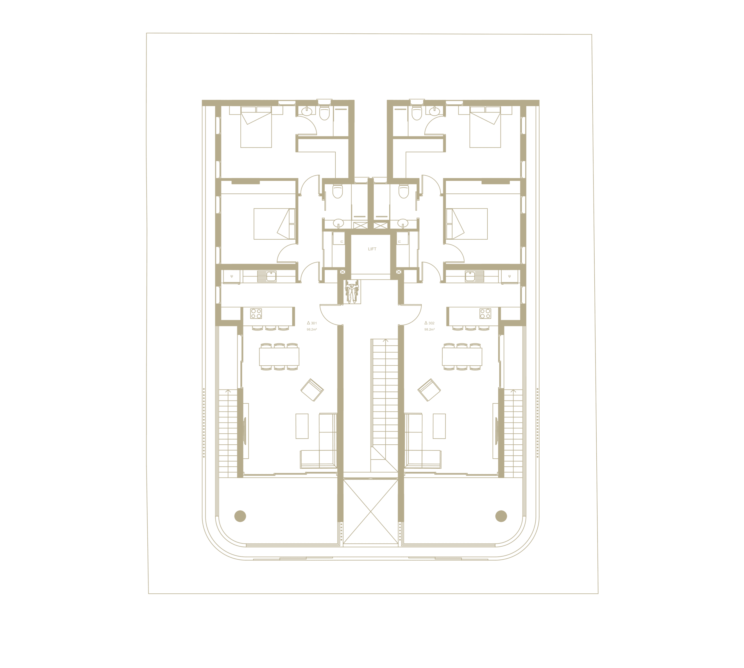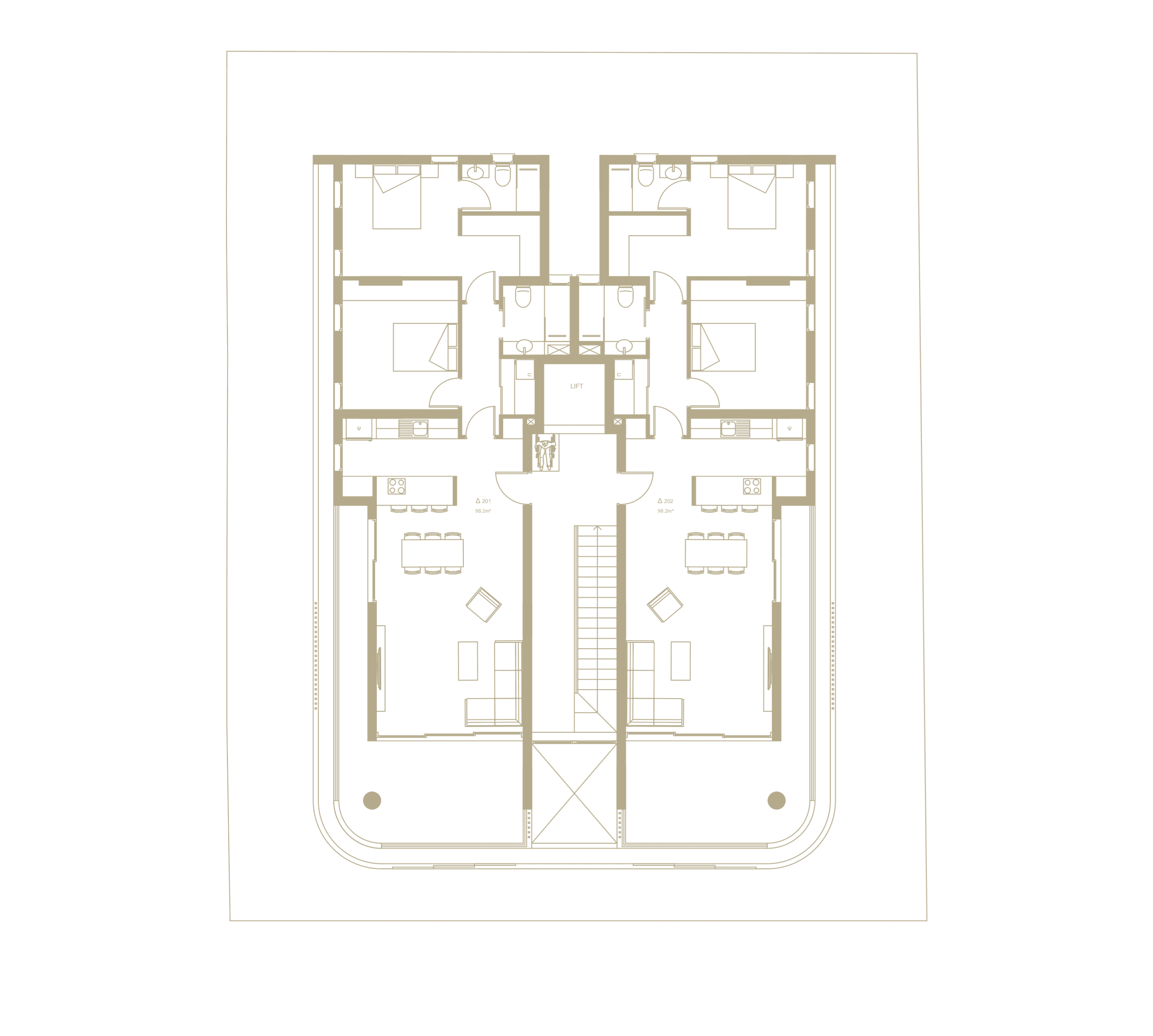 A thoughtfully designed floor plan featuring two fully detached 2-bedroom apartments per floor. Each apartment includes an open-plan kitchen, dining, and living area, with large verandas and natural light throughout. Designed for privacy and comfort, with no shared walls between residences.
